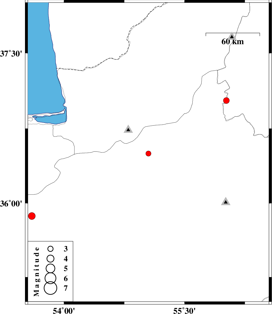 | 2015/03/15 | 00:29:34.9 | 03:59:34.9 | 35.87 | 53.6 | 15 | ML3.9 | Semnan Province, 38 km North-East of Semnan | ||