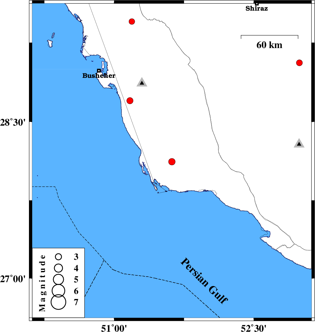 | 2015/04/03 | 13:09:06.6 | 17:39:06.6 | 28.7 | 51.17 | 8 | ML3.1 | Bushehr Province, 20 km West of Khormog | ||