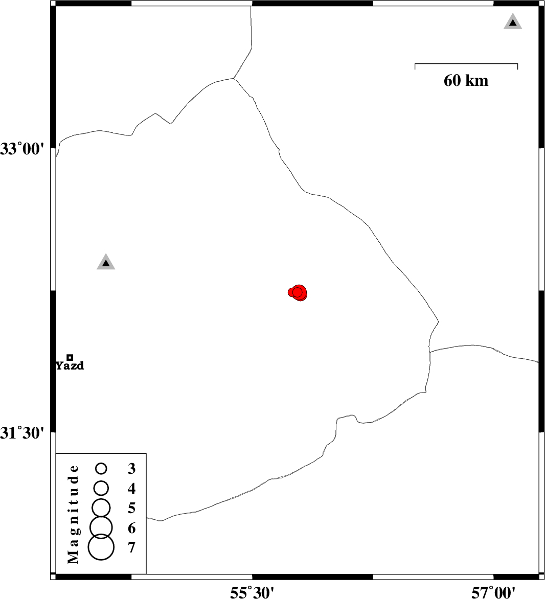 | 2015/03/30 | 06:45:25.1 | 11:15:25.1 | 32.23 | 55.8 | 14 | ML3.6 | Yazd Province, 80 km North-East of Bafq |