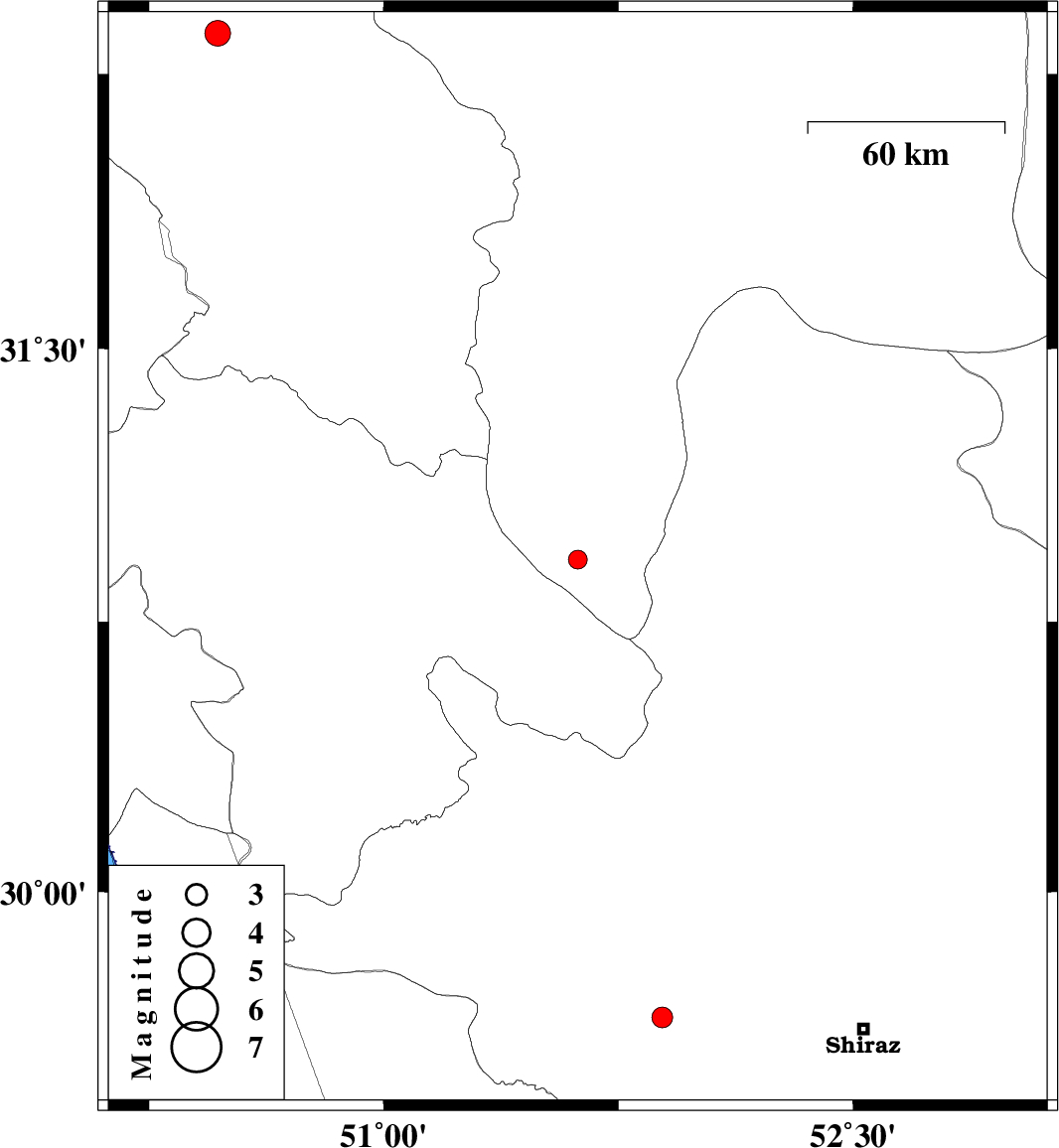 | 2015/04/09 | 21:39:57.6 | 02:09:57.6 | 29.65 | 51.89 | 21 | ML2.9 | Fars Province, 23 km East of Kazerun | ||