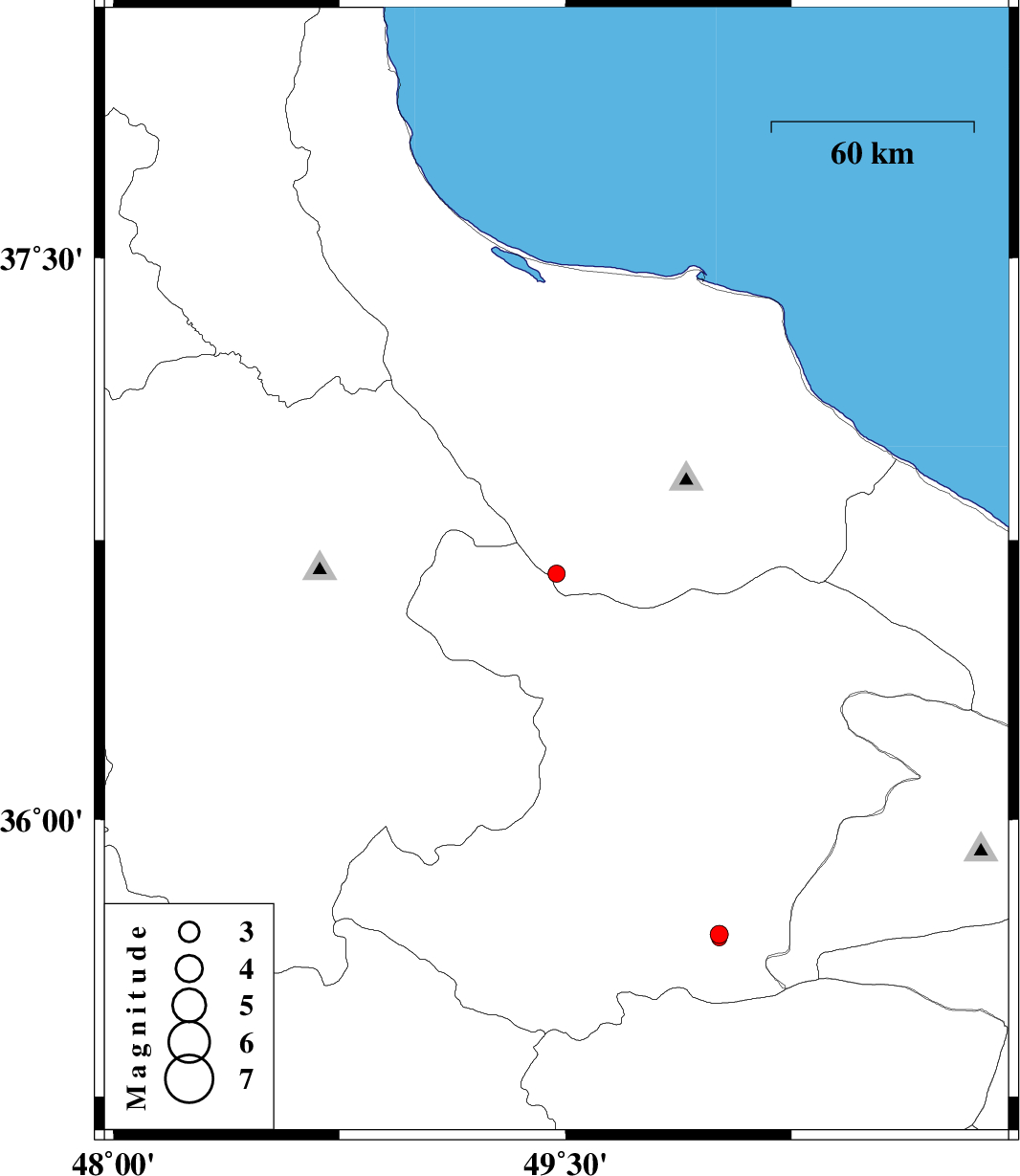 | 2015/04/14 | 09:53:08.6 | 14:23:08.6 | 36.66 | 49.47 | 14 | ML2.5 | Gilan Province, 18 km South of Rudbar | ||