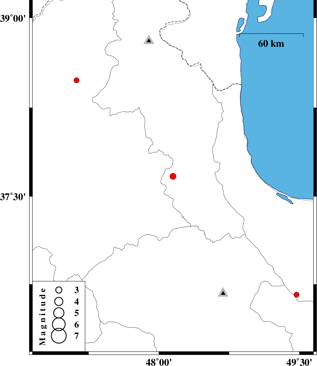 | 2015/04/15 | 02:02:57.9 | 06:32:57.9 | 37.67 | 48.15 | 14 | ML2.9 | Ardebil Province, 21 km West of Givi | ||