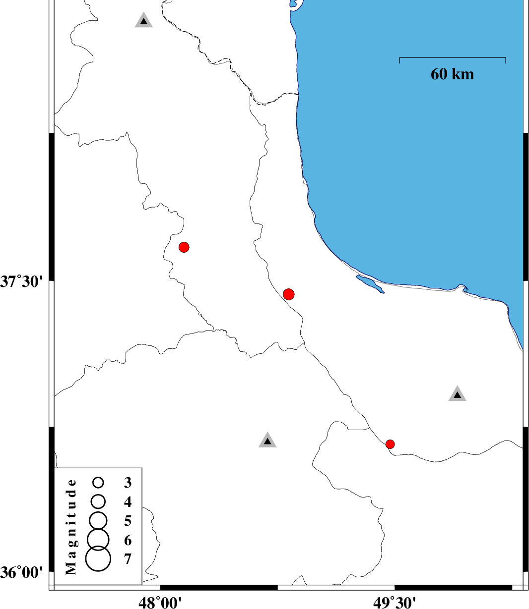 | 2015/04/14 | 09:53:08.6 | 14:23:08.6 | 36.66 | 49.47 | 14 | ML2.5 | Gilan Province, 18 km South of Rudbar |