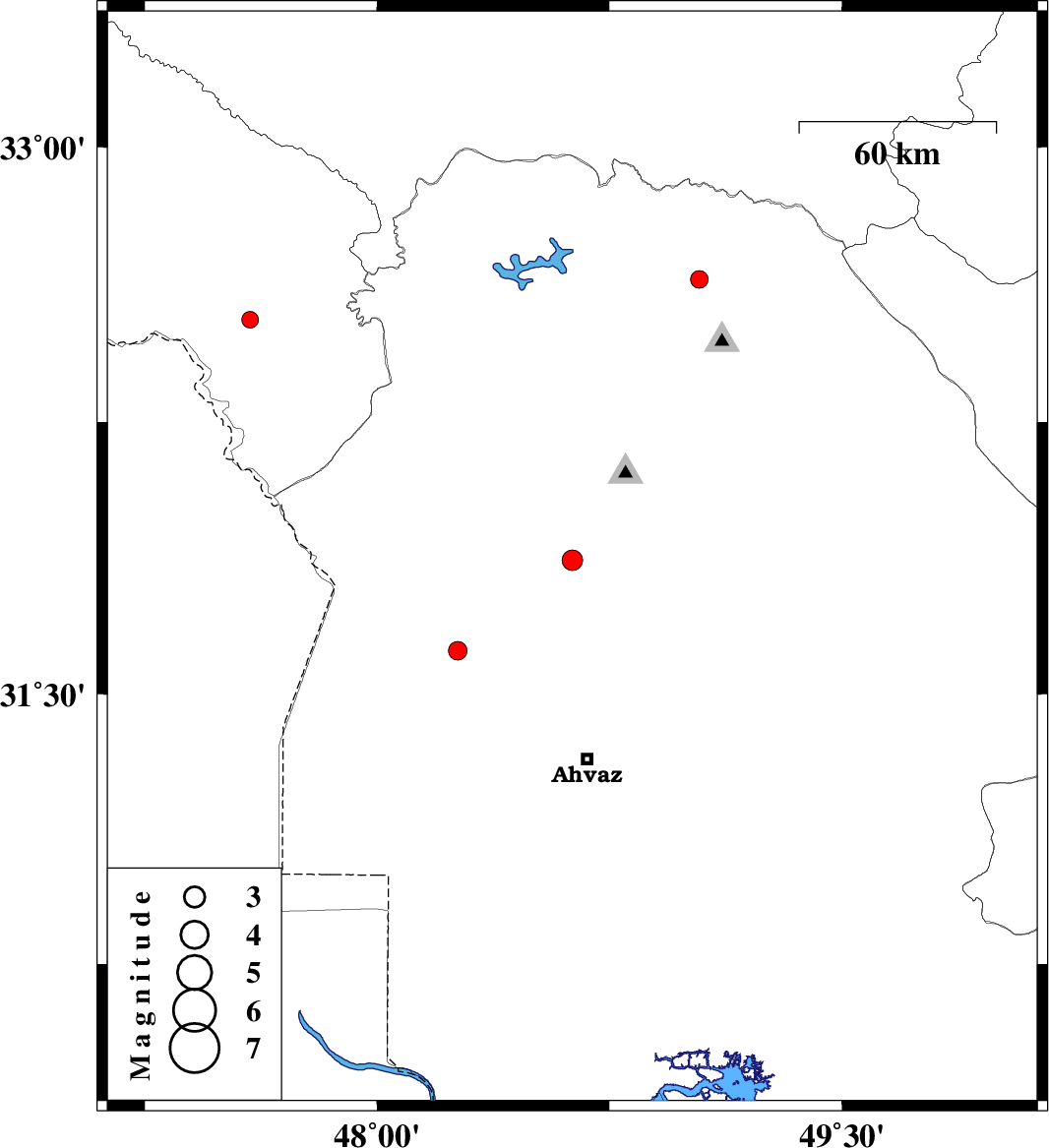 | 2015/04/18 | 23:23:23.2 | 03:53:23.2 | 31.87 | 48.63 | 14 | ML3 | Khoozestan Province, 29 km South-West of Shushtar | ||