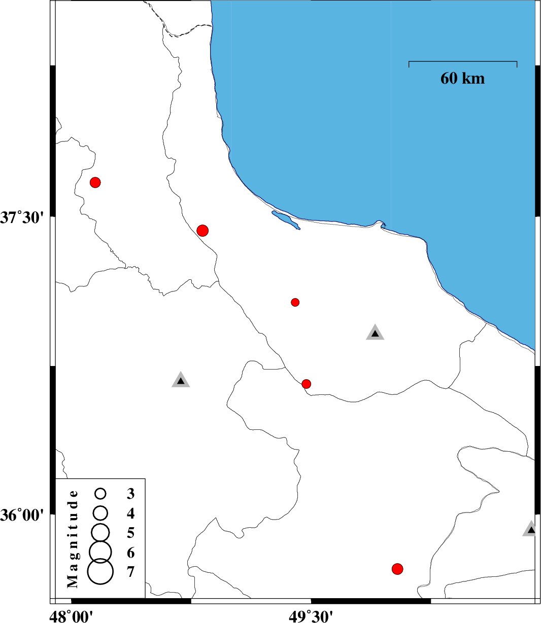 | 2015/04/14 | 09:53:08.6 | 14:23:08.6 | 36.66 | 49.47 | 14 | ML2.5 | Gilan Province, 18 km South of Rudbar |