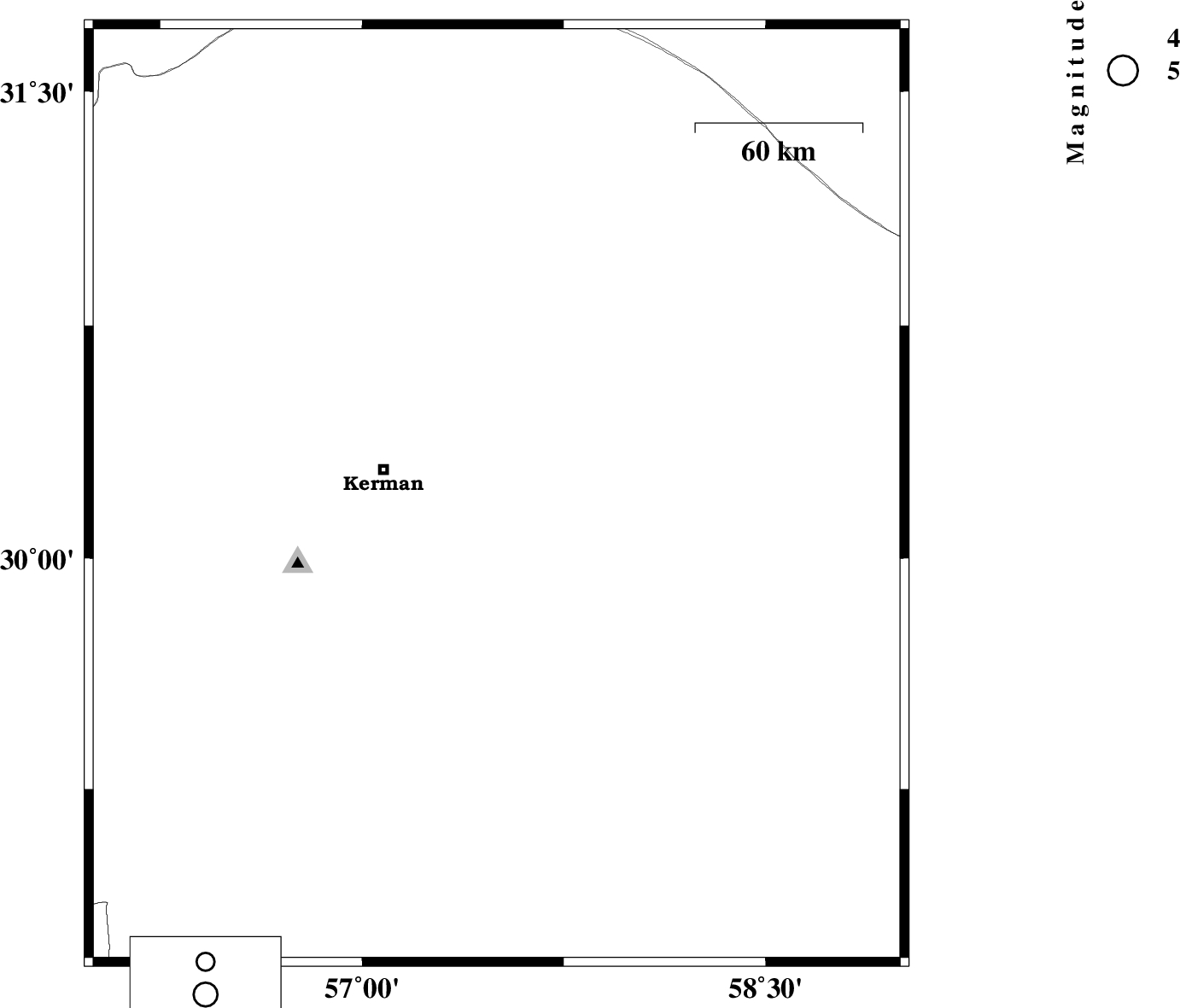 | 2015/04/22 | 00:34:17.2 | 05:04:17.2 | 30.2 | 57.5 | 15 | ML2.6 | Kerman Province, 42 km East of Kerman | ||