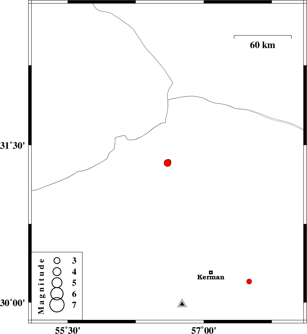 | 2015/04/22 | 00:34:17.2 | 05:04:17.2 | 30.2 | 57.5 | 15 | ML2.6 | Kerman Province, 42 km East of Kerman |