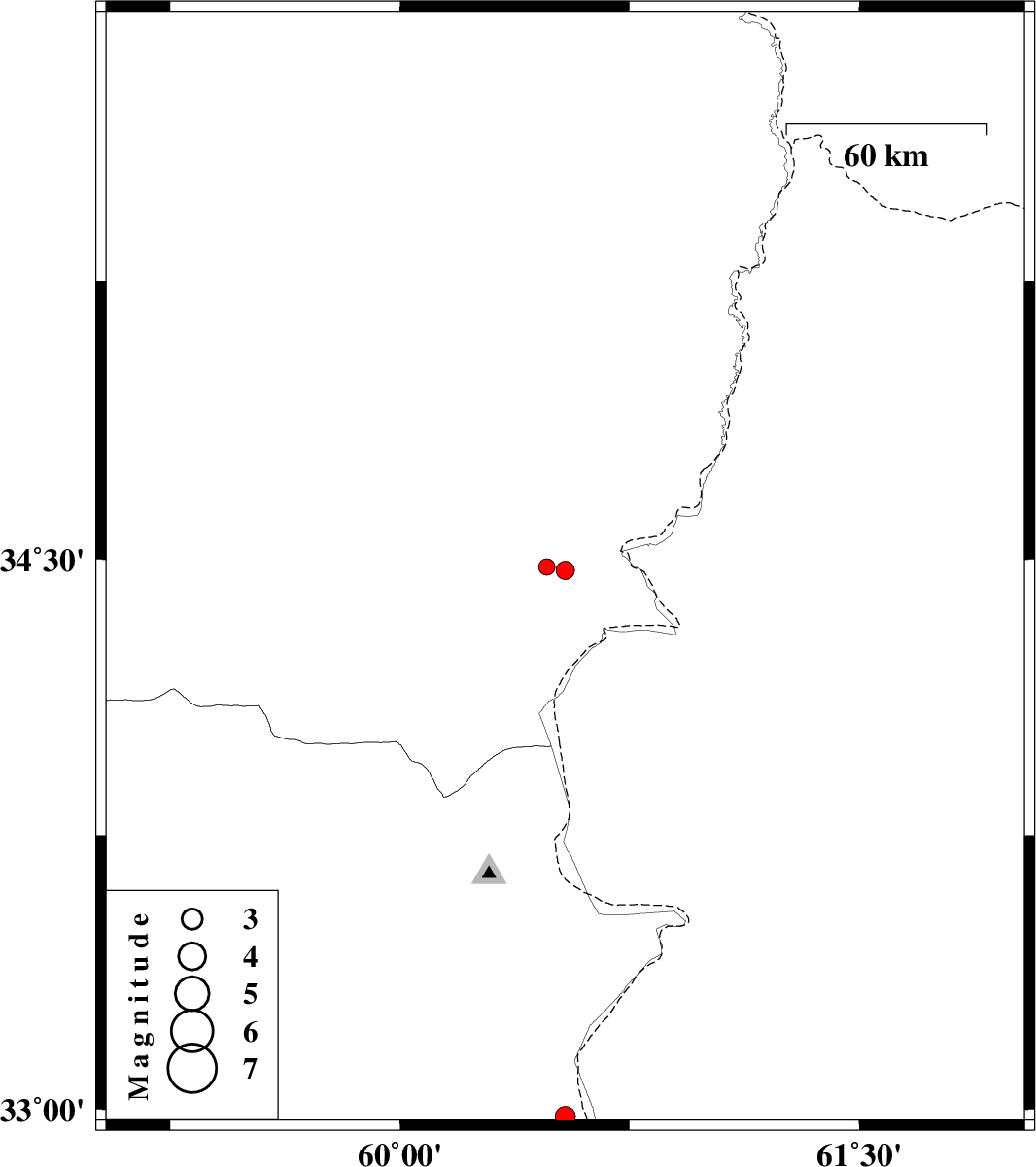 | 2015/04/14 | 16:55:54.4 | 21:25:54.4 | 32.98 | 60.54 | 26 | ML2.9 | Khorasan(south) Province, 80 km North-East of Sarbisheh |