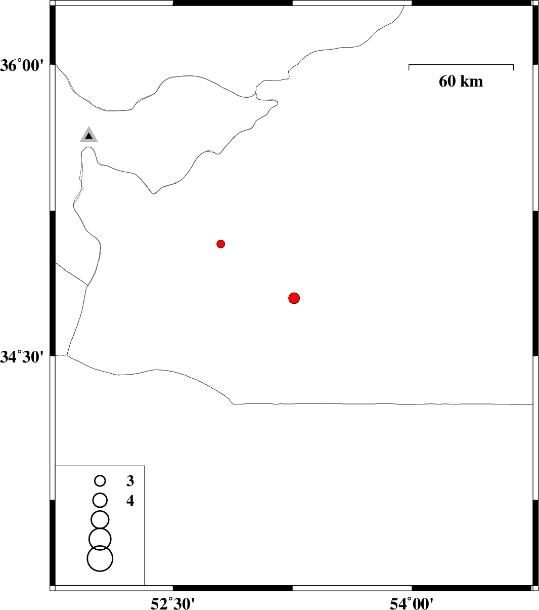 | 2015/04/30 | 18:37:56.4 | 23:07:56.4 | 35.08 | 52.8 | 46 | ML2.2 | Semnan Province, 45 km South-East of Garmsar |