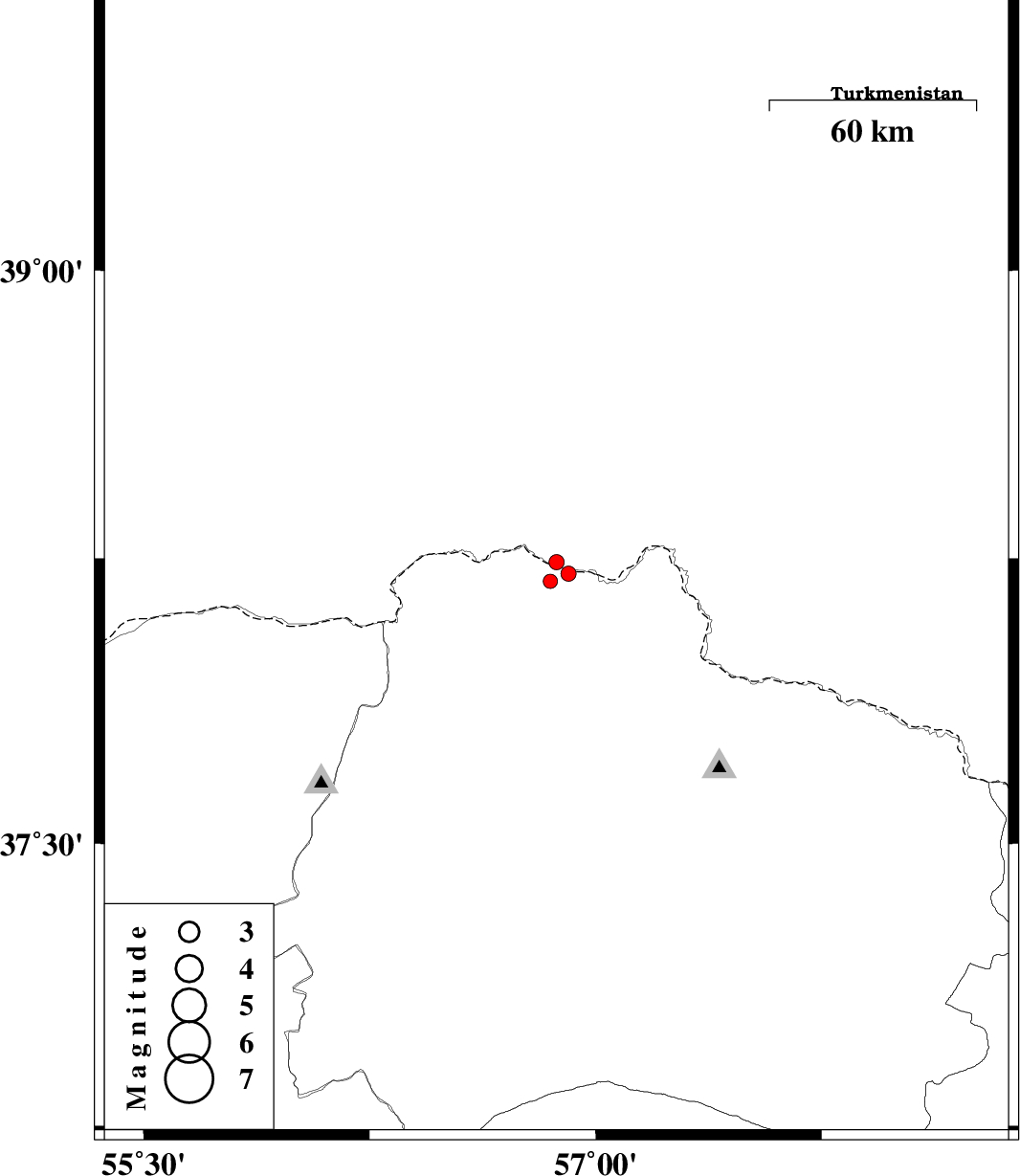 | 2015/05/09 | 17:33:54.7 | 22:03:54.7 | 38.19 | 56.85 | 6 | ML2.1 | Khorasan(north) Province, 71 km North of Ashkhaneh | ||