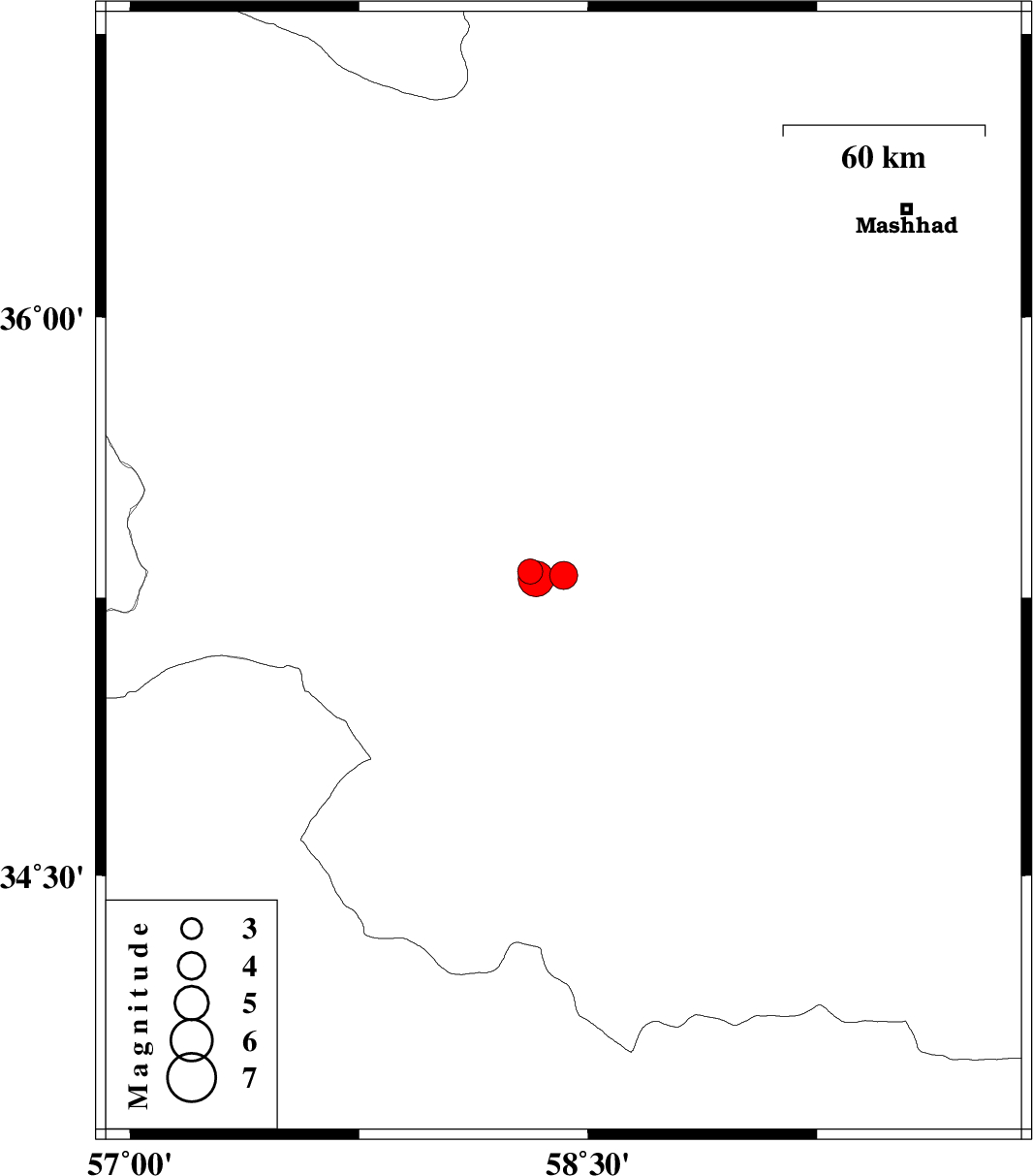 | 2015/05/10 | 02:02:55.3 | 06:32:55.3 | 35.31 | 58.42 | 15 | ML4.1 | Khorasan(center) Province, 9 km Kashmar | ||
