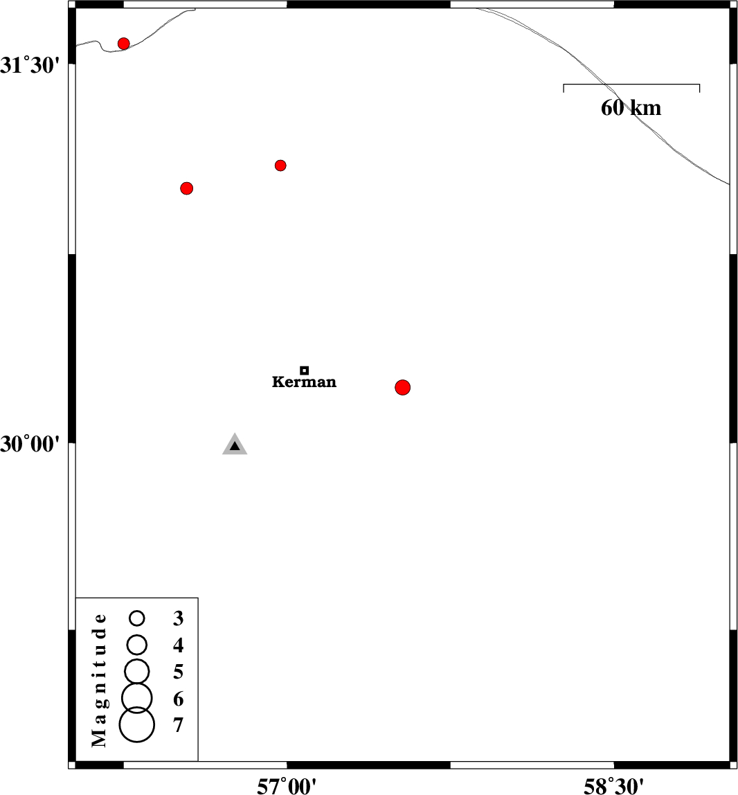 | 2015/05/11 | 09:05:18.2 | 13:35:18.2 | 30.22 | 57.53 | 14 | ML3.1 | Kerman Province, 44 km East of Kerman | ||