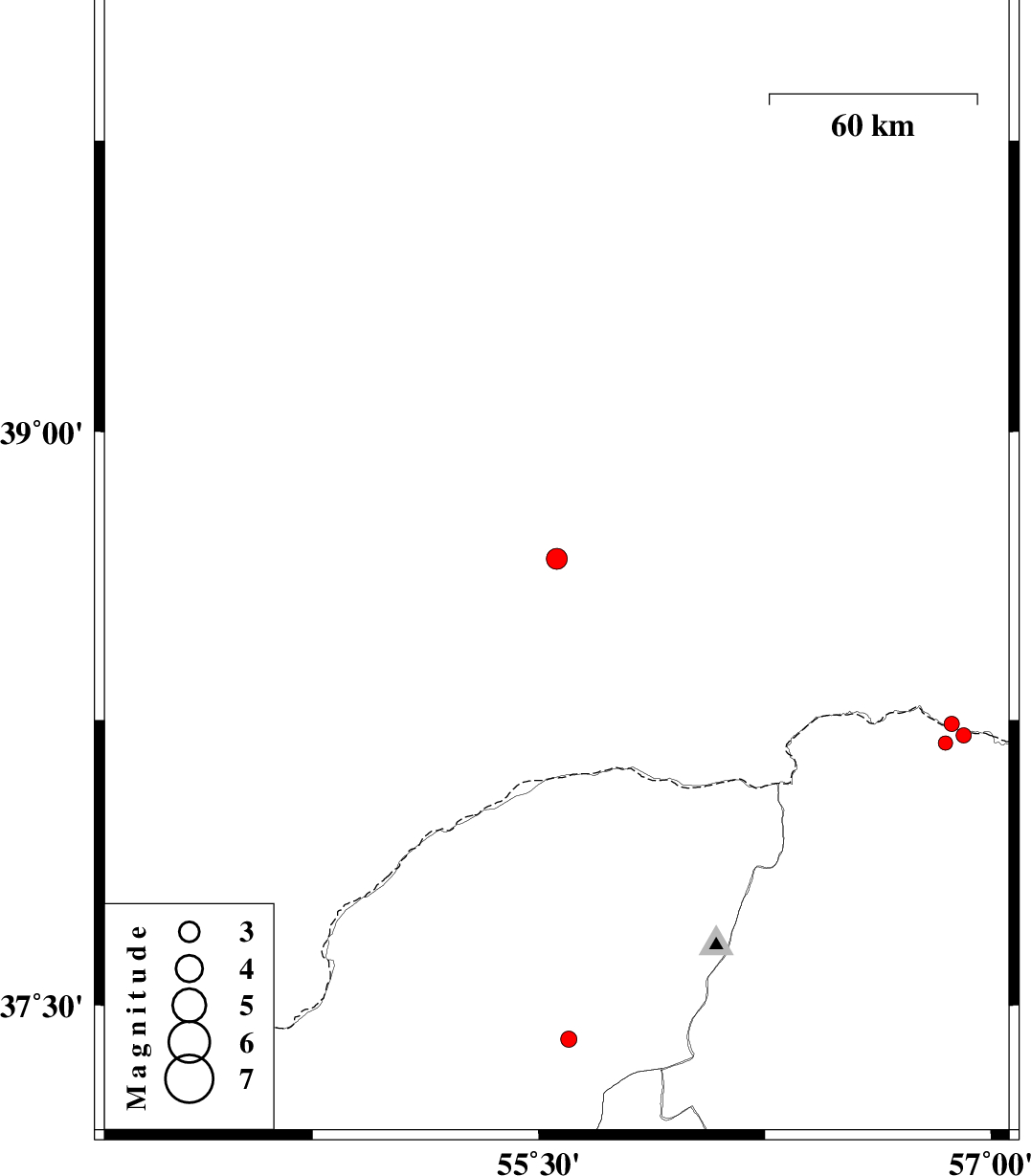 | 2015/05/09 | 17:33:54.7 | 22:03:54.7 | 38.19 | 56.85 | 6 | ML2.1 | Khorasan(north) Province, 71 km North of Ashkhaneh | ||