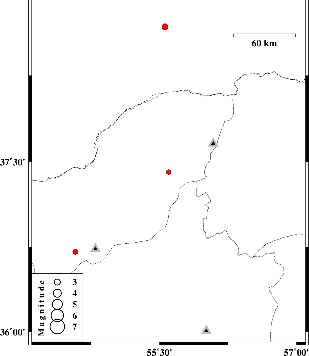 | 2015/05/16 | 00:26:10.6 | 04:56:10.6 | 36.71 | 54.58 | 14 | ML2.7 | Golestan Province, 19 km South-East of Gorgan |