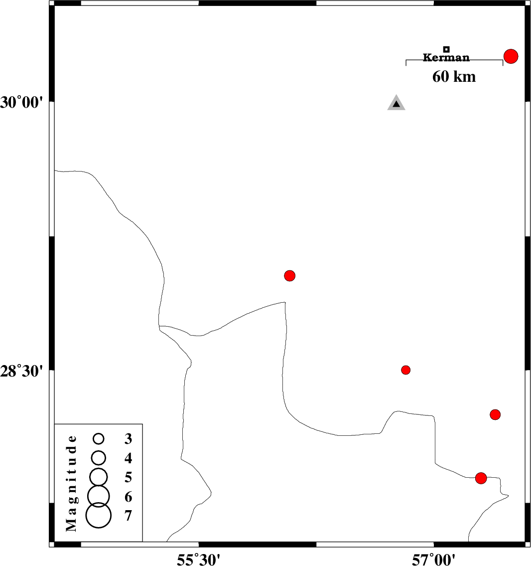 | 2015/05/20 | 18:44:27.8 | 23:14:27.8 | 28.25 | 57.39 | 18 | ML2.9 | Kerman Province, 45 km North-West of Kahnuj |