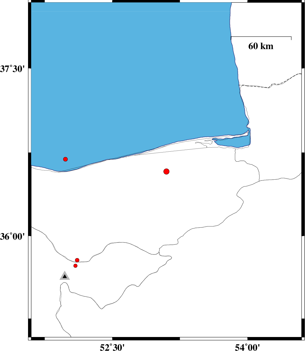 | 2015/06/03 | 13:21:05.1 | 17:51:05.1 | 36.69 | 51.98 | 14 | ML2.1 | Caspian Sea, 14 km North of Nur | ||
