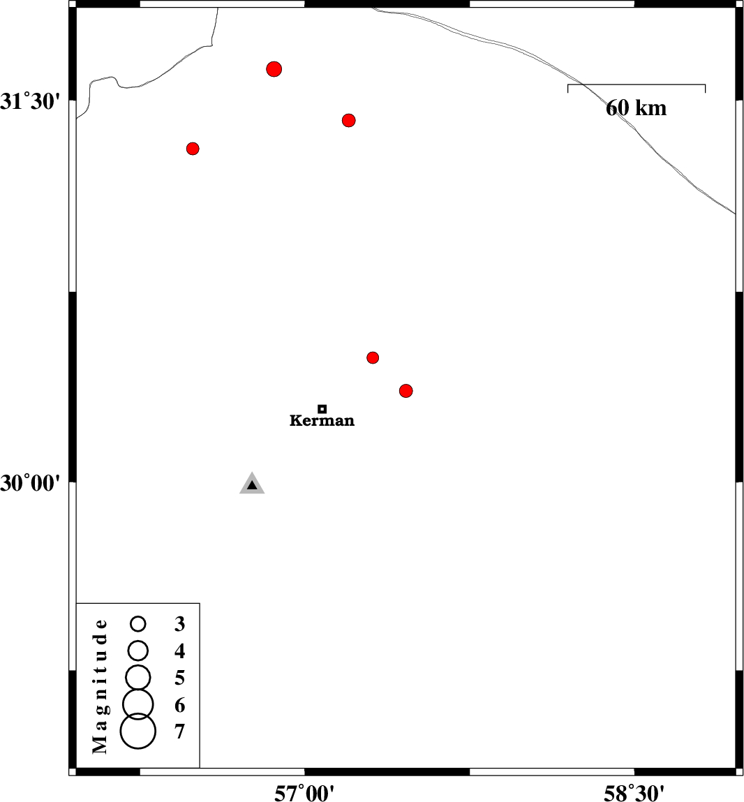 | 2015/06/08 | 06:59:32.6 | 11:29:32.6 | 30.36 | 57.46 | 14 | ML2.7 | Kerman Province, 37 km East of Kerman | ||