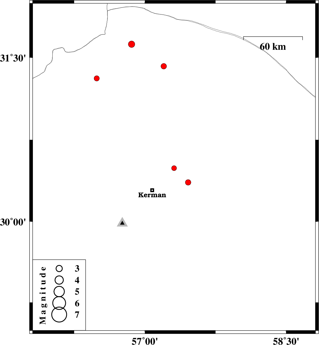 | 2015/06/08 | 06:59:32.6 | 11:29:32.6 | 30.36 | 57.46 | 14 | ML2.7 | Kerman Province, 37 km East of Kerman | ||