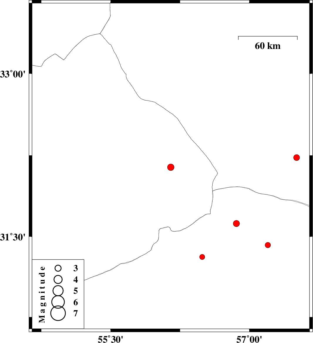| 2015/06/02 | 06:13:29.9 | 10:43:29.9 | 31.42 | 57.2 | 14 | ML2.7 | Kerman Province, 41 km North-East of Ravar |