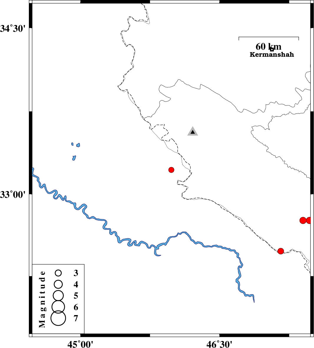 | 2015/05/12 | 13:24:25.7 | 17:54:25.7 | 32.76 | 47.47 | 14 | ML3.3 | Ilam Province, 19 km South of Abdanan |