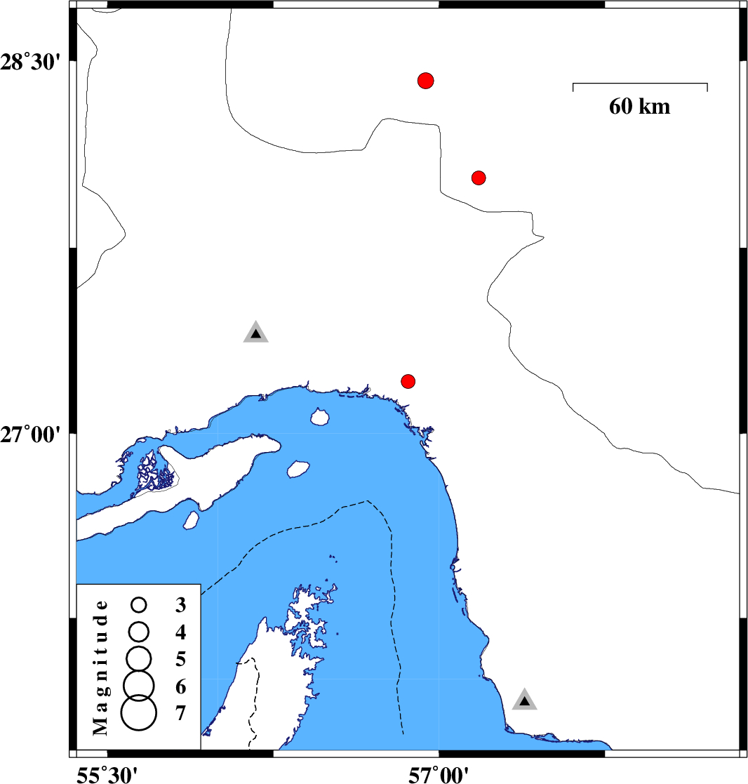 | 2015/06/08 | 07:39:28.7 | 12:09:28.7 | 28.03 | 57.18 | 18 | ML2.8 | Kerman Province, 51 km West of Kahnuj |