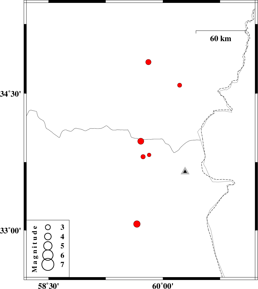 | 2015/06/05 | 18:27:01.4 | 22:57:01.4 | 33.81 | 59.74 | 14 | ML2.7 | 50 km East of Qaen | ||