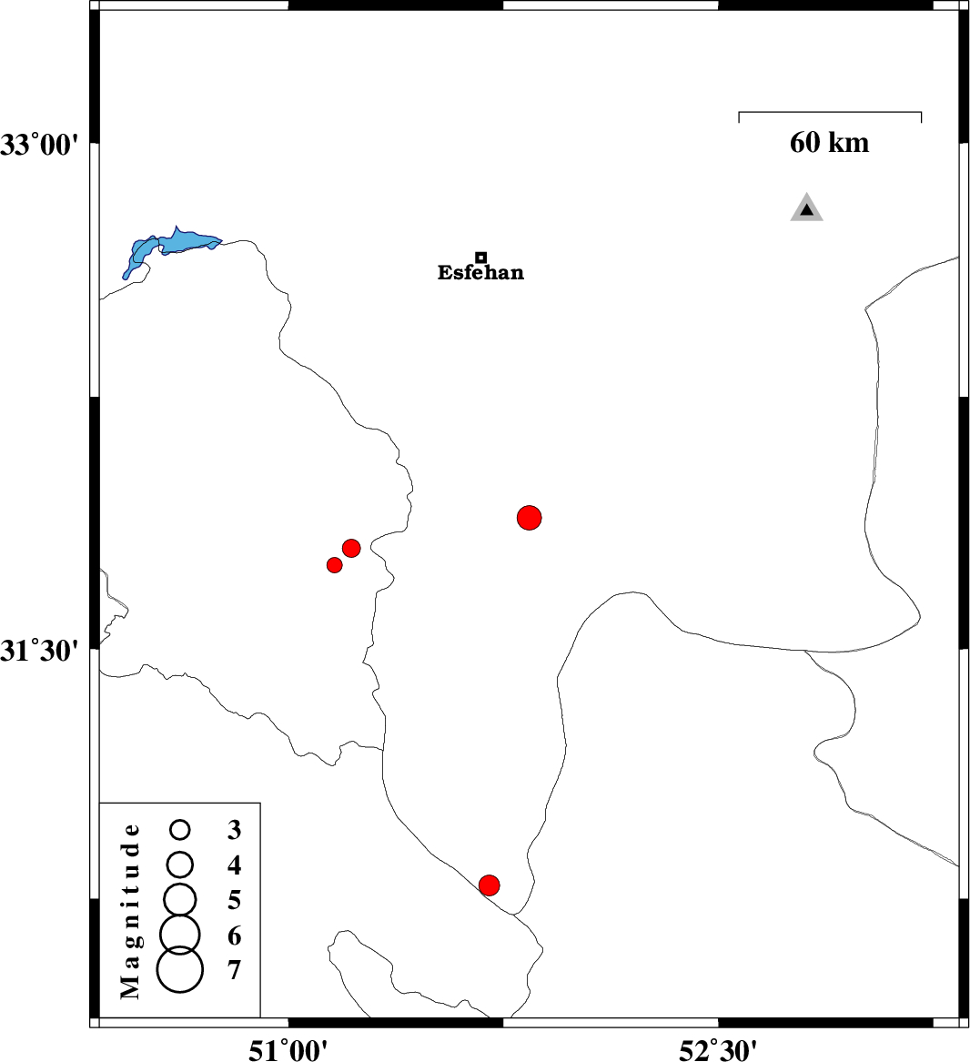 | 2015/06/20 | 12:38:02.4 | 17:08:02.4 | 31.89 | 51.84 | 14 | ML3.8 | Esfahan Province, 14 km South of Shahreza | ||