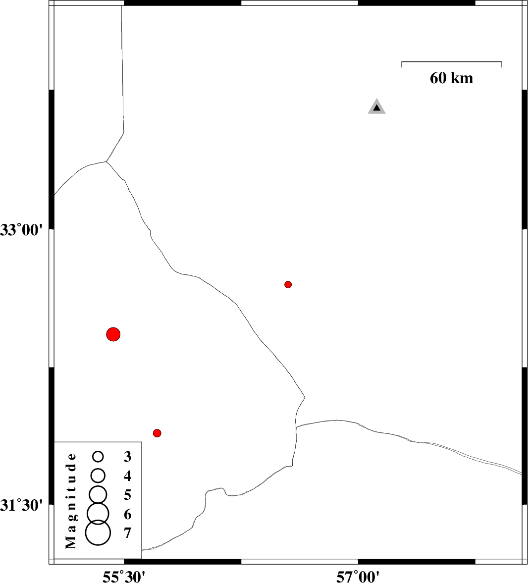 | 2015/06/17 | 23:05:43.2 | 03:35:43.2 | 32.43 | 55.43 | 14 | ML4 | Yazd Province, 91 km North of Bafq |