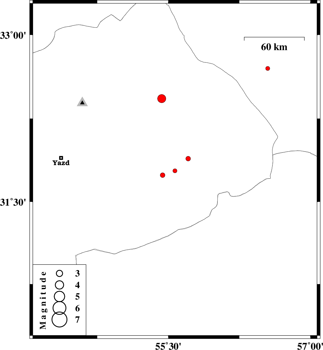 | 2015/06/17 | 23:05:43.2 | 03:35:43.2 | 32.43 | 55.43 | 14 | ML4 | Yazd Province, 91 km North of Bafq |