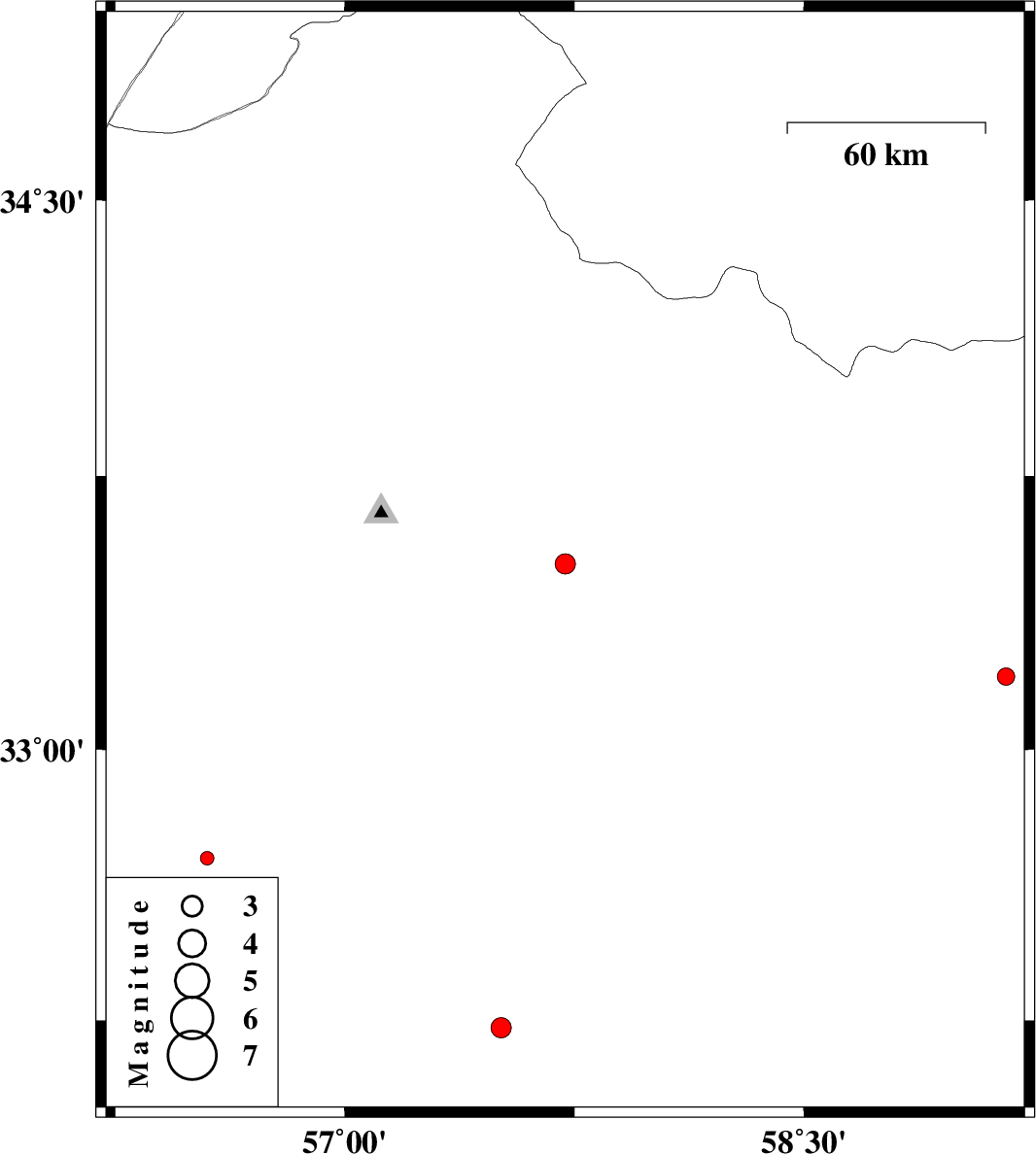 | 2015/06/22 | 07:17:12.8 | 11:47:12.8 | 32.7 | 56.55 | 14 | ML2 | Yazd Province, 106 km South-West of Tabas | ||